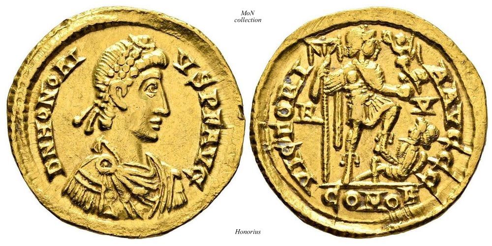 Solidus (4.49 g), Ravenna, 402-406 AD. Bust with pearl diadem, drapery and cuirass / Kaiser with labarum and Victoria globe, sets foot on reclining captivus, Sigle: R – V (in the fields) / COM OB (in section). RIC X 1287, Depeyrot 7/1. Small bruises (also on the round – traces of the frame?), Minimally clipped.